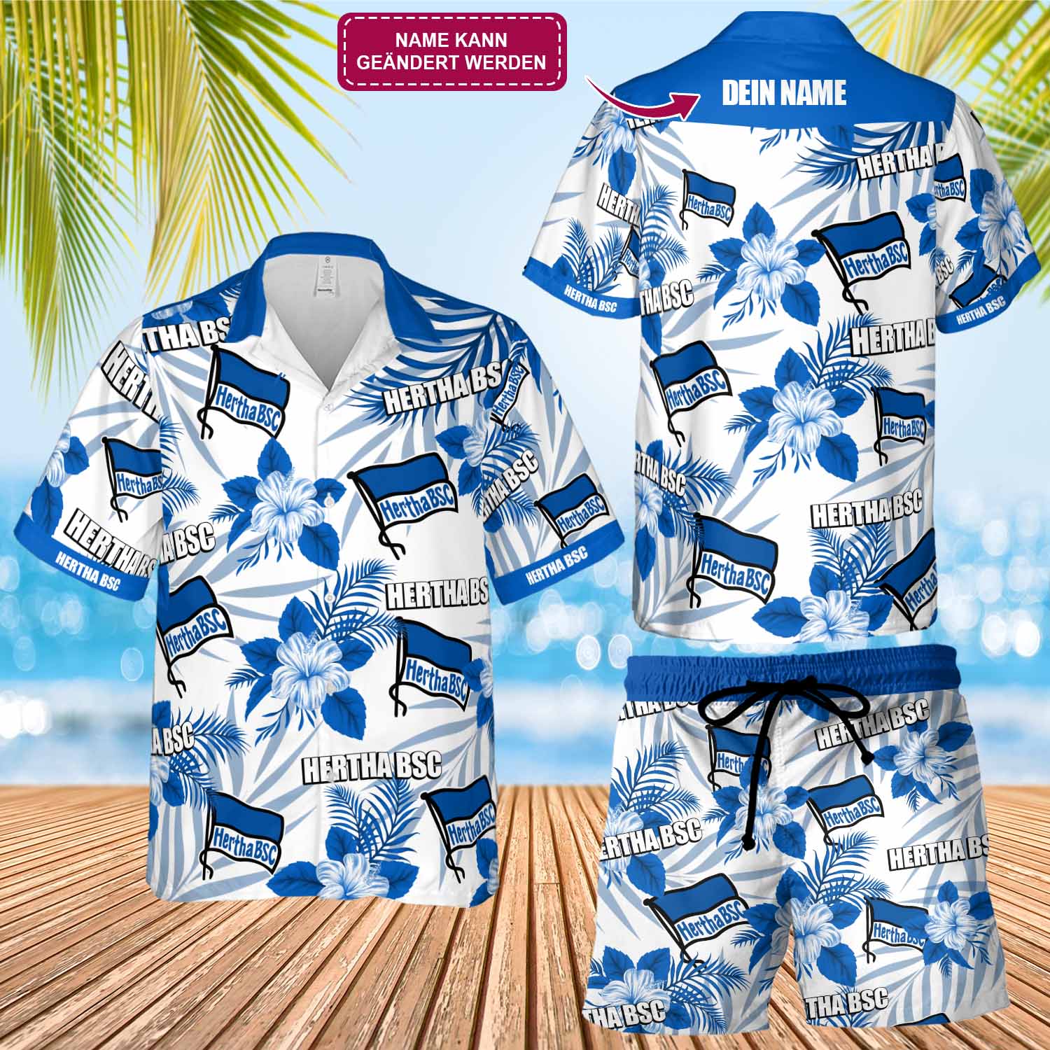 Hertha BSC Hawaii Hemd & Badeshorts Sommer 2-teilig Aloha Shirt mit Blumen Print Konzert Kostüm Urlaub Outfit